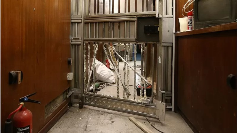 Попав в здание, грабители проникли в шахту лифта и опустили туда бур, чтобы просверлить отверстие в хранилище, размещавшееся в подвале, и начали индустриальным буром сверлить бетонную стену толщиной 50 см. Но безуспешно. Когда просверлили бетон, оказалось, что там была еще и металлическая решетка.