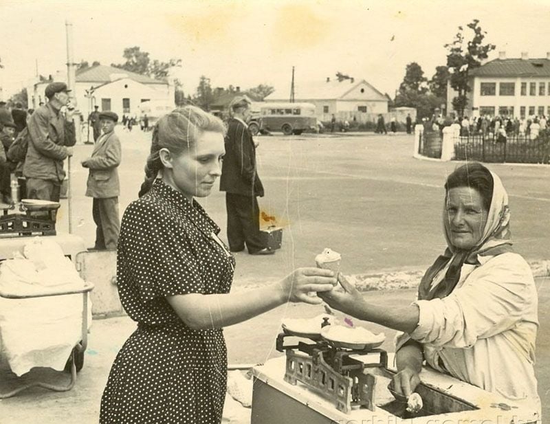 Гомельчанка покупает мороженое в районе Железнодорожного вокзала, 50-е годы.