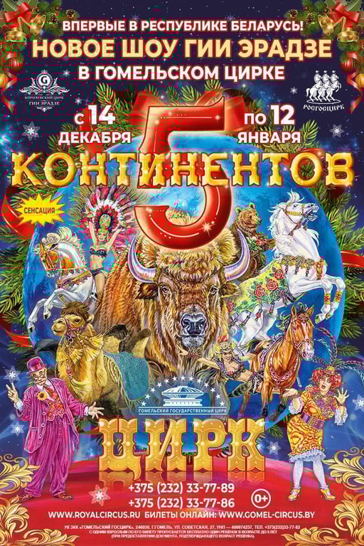 Шоу «Росгосцирка» и заслуженного артиста России Гии Эрадзе уже не один сезон проходят в Гомеле с аншлагом. Труппа снова приедет на гастроли. Легендарную программу «5 континентов» будут показывать с 14 декабря по 12 января.