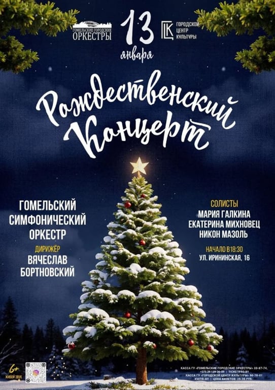 Рождественский концерт состоится в ГЦК. Билеты продаются в диапазоне 25-35 BYN. Начало в 18:30.