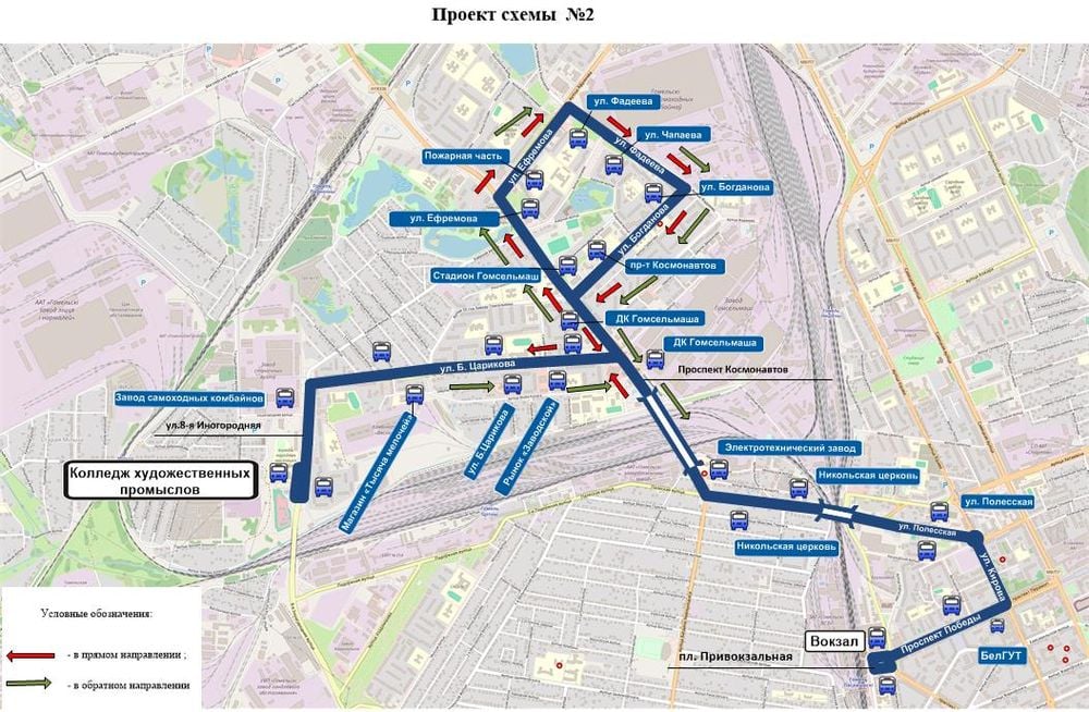 В первом варианте после колледжа маршрут можно продлить в Советский район. По задумке, после остановки «Гомельторгмаш» автобус повернёт налево на улицу Владимирова и проследует в центр города по ней, улицам Продольной и Полесской, повторяя трассу автобусов №№16 и 16а.