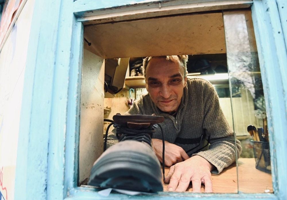 Рабочее место Александра — арендованный ларек на улице Мазурова. В своей миниатюрной мастерской мужчина проводит по восемь часов в день, успевая привести в порядок 5-6 пар обуви. Починки ждут женские ботинки с шипами, полностью усыпанные стразами шпильки, старенькие «найки», убитые осенней непогодой полуботинки.