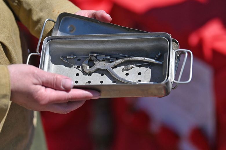 − Извините меня за слезы, но рассказывая о боевом пути лейтенанта медицинской службы Марии Афанасьевны Гарачук, без них никак. В 1939 году она поступила в Гомельское медучилище, в мае 41-го окончила его, вышла замуж, но все планы на счастливую жизнь оборвала война… Мария отправилась на фронт вслед за мужем и через несколько дней стала вдовой. Хрупкая девушка, при этом сильная и мужественная, она решила сделать всё от нее зависящее, чтобы отомстить за мужа и избавить Родину от коричневой чумы. Вынесла с поля боя 146 тяжелораненых советских солдат, 35 раз сдала для них кровь. О доблести этой женщины говорят её многочисленные награды, и особенно: медаль имени Флоренс Найтингейл. Свои погоны и эти медицинские инструменты Мария Афанасьевна в 80-е годы передала музею Красного Креста, который действует на базе школы №47.