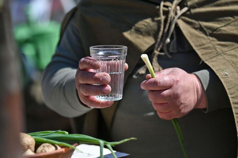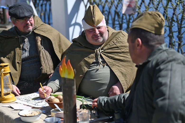 − Мой герой подорвал гранатой машину фашистов-разведчиков, и его отбросило взрывной волной. Если бы не товарищ, который вытащил друга с поля боя, солдат пал бы смертью храбрых. Главная же цель нашего партизанского отряда – пустить под откос немецкий поезд. Ждём боеприпасы, а пока обедаем. Каша, тушёнка, цыбуля и 100 граммов (бутафорские – прим.ред.) – что ещё нужно бойцу?