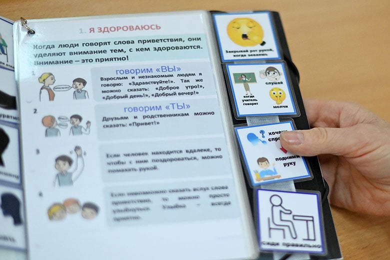 Контролировать своё поведение и разбираться в школьных правилах тьютор Антонина Ломан учит Платона при помощи специальных карточек, так называемых зрительных опор. Ведь визуально ребёнку с такой особенностью проще усвоить информацию, чем на слух.
