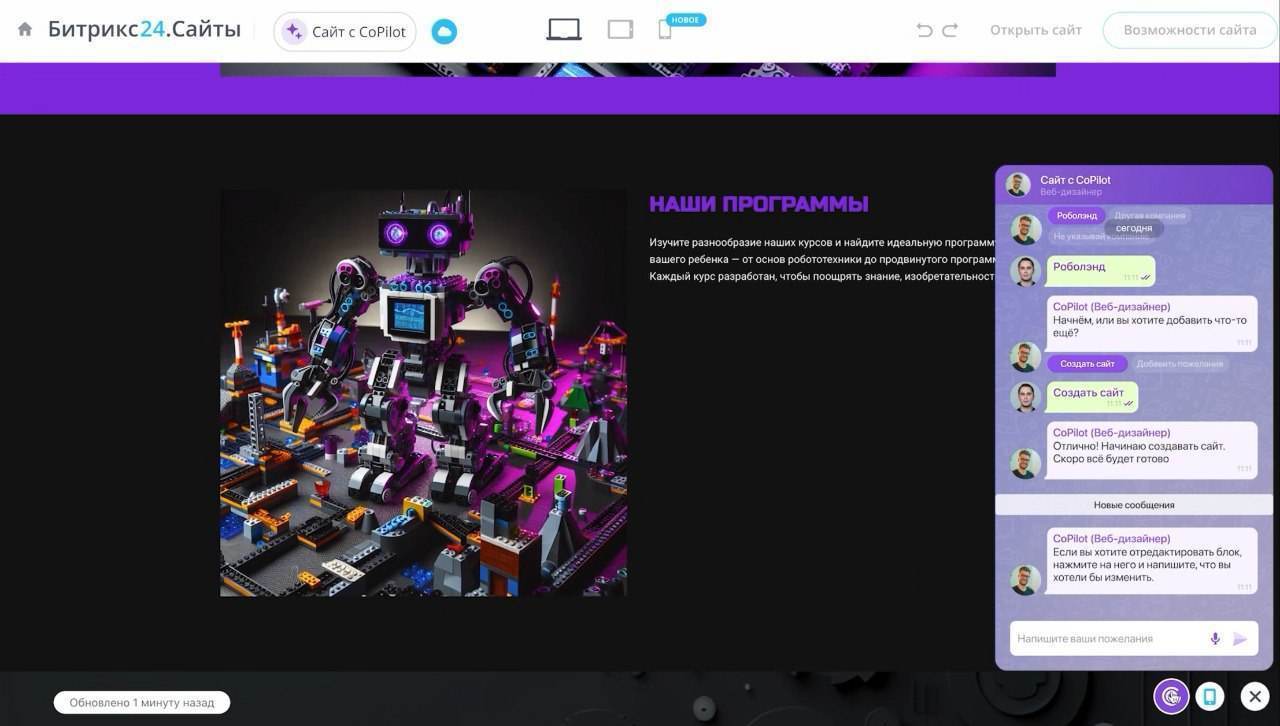 Для могилевских предпринимателей важна не только эффективность внутренних процессов, но и наличие конкурентоспособного онлайн-присутствия. С помощью AI-помощника Copilot в Битрикс24 создание сайта стало проще, чем когда-либо. Нейросеть автоматически генерирует структуру и тексты для сайтов по запросу, что ускоряет создание цифровых витрин для бизнеса.