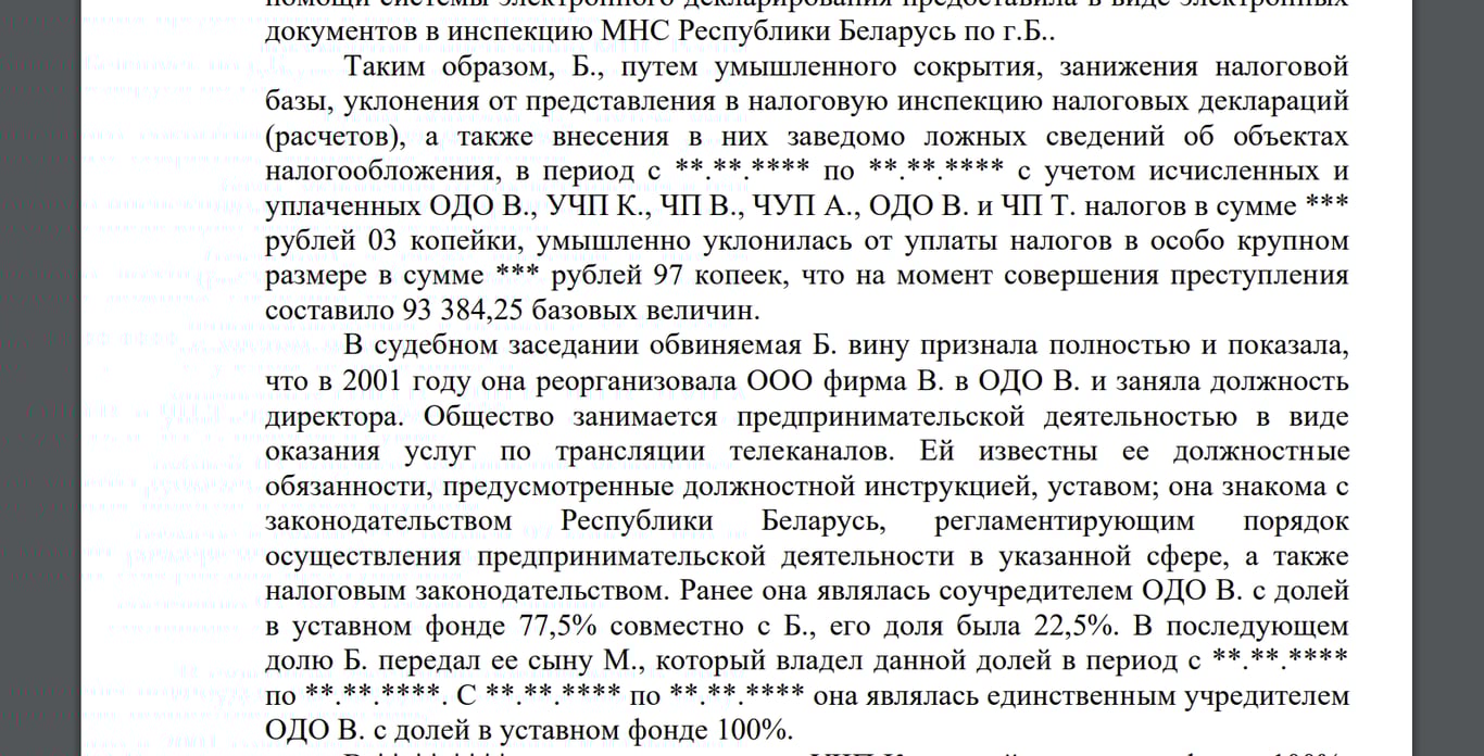 В итоге суд признал бобруйчанку виновной и назначил ей наказание в виде лишения свободы на срок 5 лет с отсрочкой на 2 года и с лишением на 5 лет права занимать руководящие должности. Также женщину оштрафовали на 500 базовых величин (20 000 рублей). С оплатой штрафа проблем не было: на счетах в банках у бывшей хозяйки кабельного ТВ Бобруйска находилось свыше 115 000 евро и более 60 000 долларов.