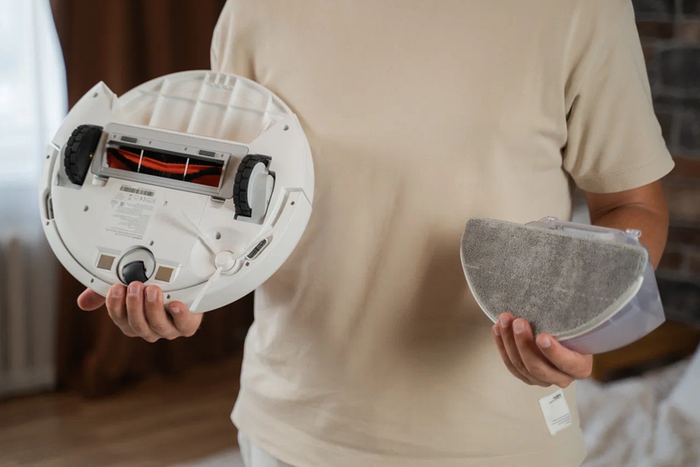 В комплекте с Vacuum S20 идут евровилка, инструкция на русском языке, док-станция, основная и боковая щётки, а также швабра для влажной уборки – в коробке с S20+ сразу 2 мопа. Они устанавливаются с обеих сторон и выходят за границы корпуса, чтобы мыть пол впритык.