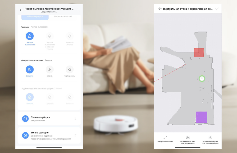 Теперь переходим к уборке с Vacuum S20 Plus. Можно настроить собственный режим или выбрать из четырёх: сухая уборка, влажная, комплексная и даже уборка пыли перед влажной.