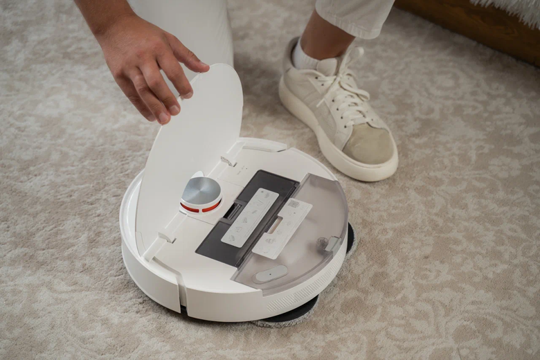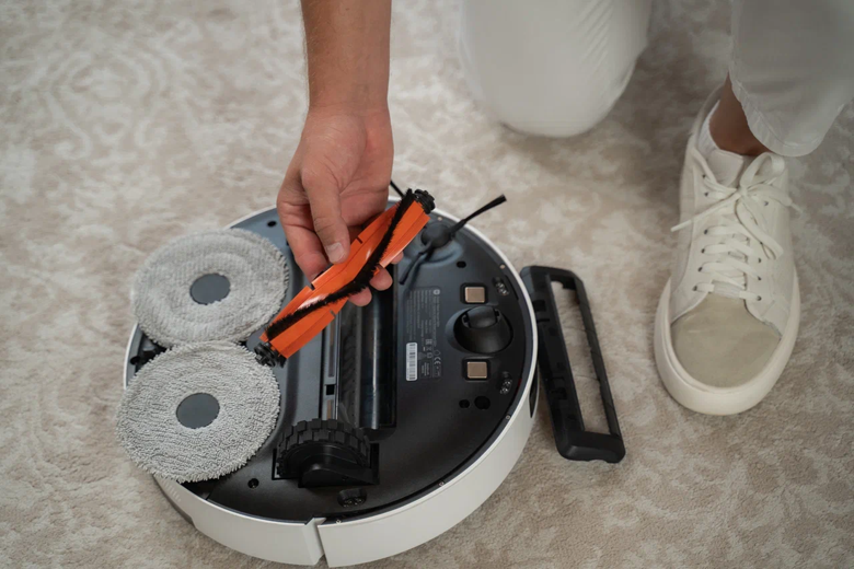 В базовой версии пылесборник (400 мл) и контейнер для воды (270 мл) можно найти под самим роботом. Они, как конструктор, собираются вместе. В комплекте с пылесборником идёт удобная щеточка для чистки. Стоит отметить, что конструкция очень практичная: пыль точно не вывалится на пол, как это бывает при очистке роботов конкурентов. Всё благодаря откидной конструкции крышки, высоким стенкам и глубокому контейнеру.