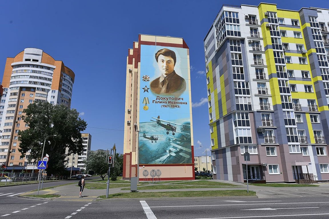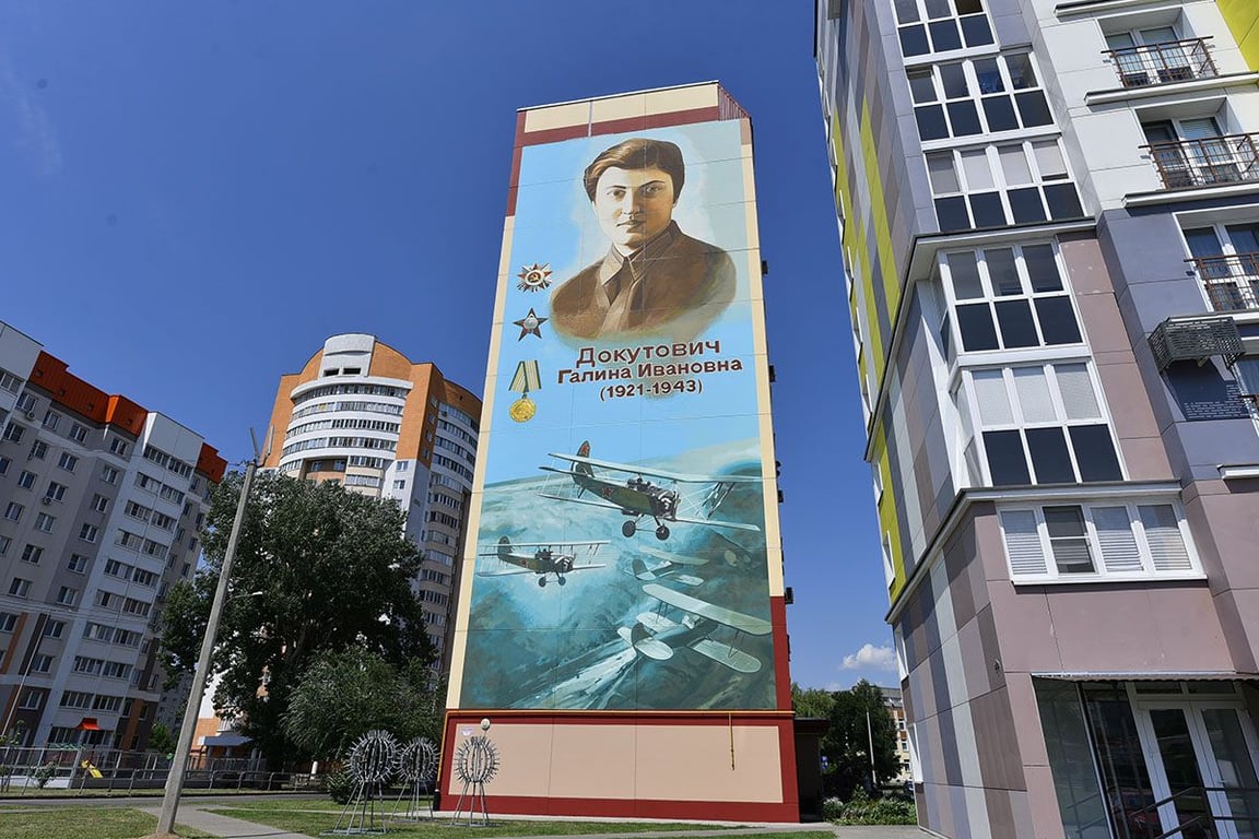 Торец дома на Красной, 3, выходящий на улицу Докутович, художники заняли полностью. Здесь изображён портрет советской лётчицы, её награды и три биплана По-2. Именно на таких летали «Ночные ведьмы» во время Великой Отечественной войны. Младший лейтенант Докутович на подобных машинах совершила 136 боевых вылета.