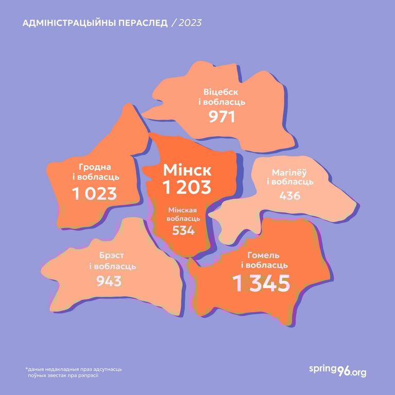 По всей стране состоялось не менее 4466 судов по «политическим» статьям. Беларусские суды назначили не менее 1822 штрафов на общую сумму в 1 524 492 рубля (почти 466 тысяч долларов). Также судьи назначили минимум 2005 арестов. Всего в изоляторах белорусы отбыли минимум 22 988 суток (почти 64 года).