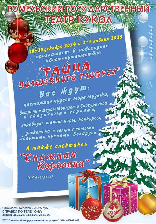 Первые представления в Театре кукол в 2025 году дадут 2 января. Перед показом спектакля «Снежная Королева» детей и их родителей пригласят на квест-путешествие «Тайна волшебного глобуса». Подробности здесь.