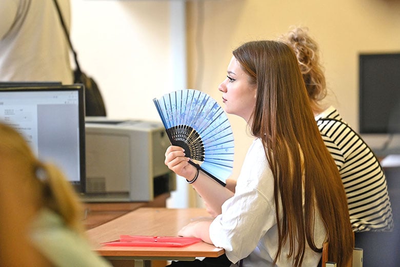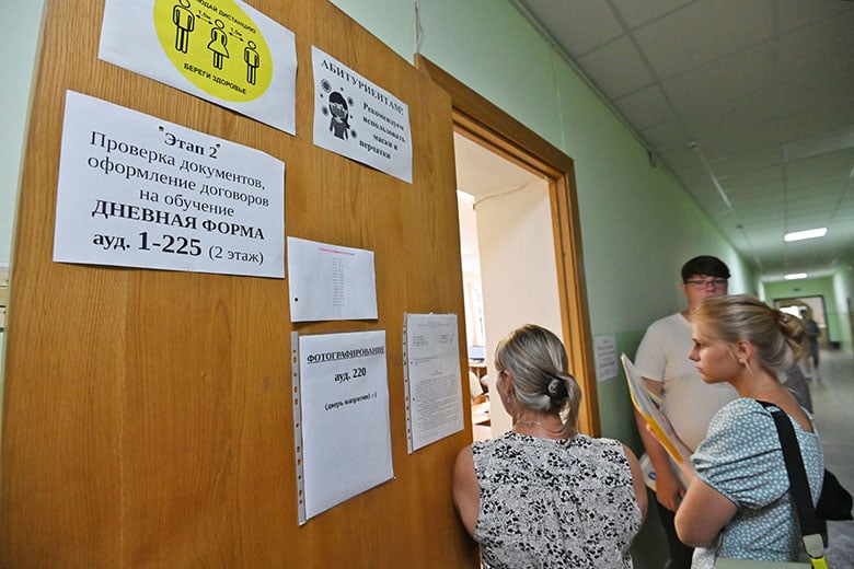 Под кабинетом приёмной комиссии волнуются с два десятка абитуриентов и их родителей. Кто-то обмахивается веером, кто-то – папкой с документами. В соседней аудитории предусмотрительно работает вентилятор, можно выпить воды.
