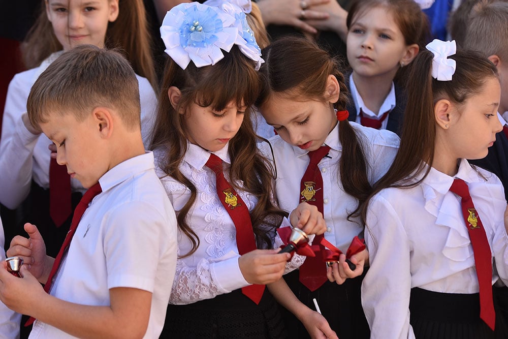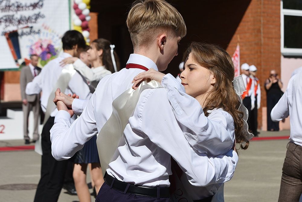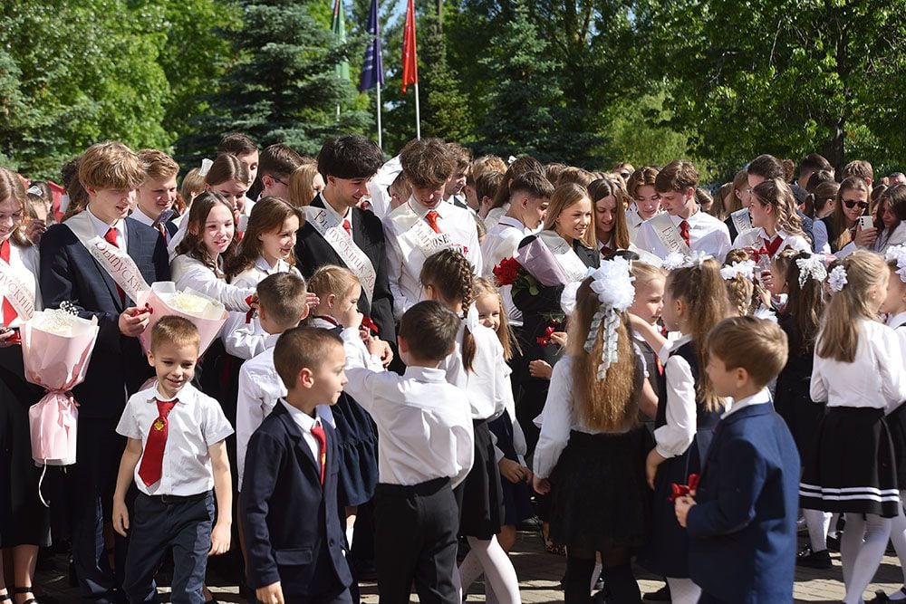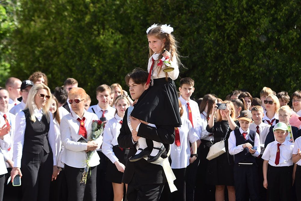 Кульминацией торжественной линейки стал вальс выпускников и поздравления от первоклассников, подаривших старшим ребятам символические колокольчики.