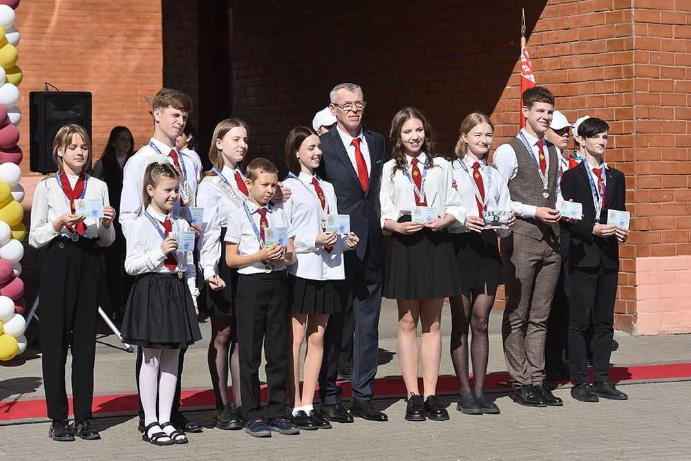 Мэр вручил преуспевшим в учебе гимназистам сертификаты на покупки в гипермаркет и попросил нынешних выпускников не снизить средний балл по итогам ЦЭ и ЦТ. В прошлом году в «51-й» он составил 84 балла.