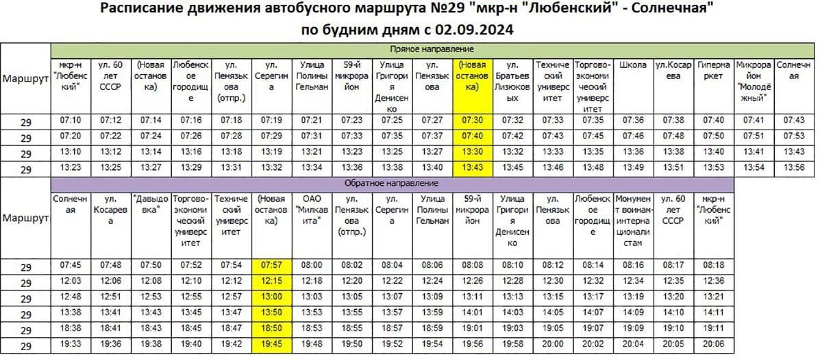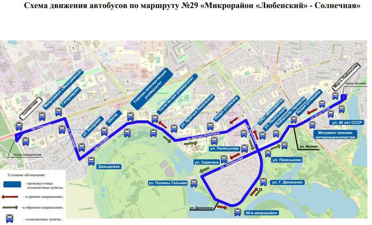 Расписание нового маршрута составлено с учетом первой и второй смен учащихся гимназии и работы детсадов. Из Любенского микрорайона автобусы №29 будут отправляться в 7:10, 7:20, 13:10 и 13:23, с остановки «Солнечная» – в 7:45, 12:03, 12:48, 13:38, 18:38, 19:33.