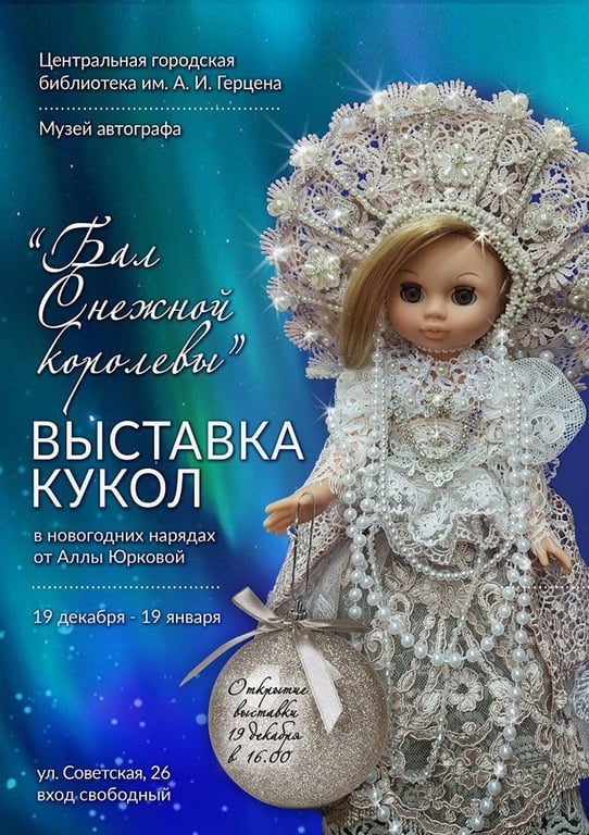 В Музее автографа городской библиотеки работает выставка «Бал Снежной Королевы» — это почти полсотни кукол, одетых в наряды от Аллы Юрковой. Образы дополнены новогодней атрибутикой: каретами, санками, сумочками, шарами и ёлочками. Возглавляют экспозицию главные героини новогодних сказок – Снегурочка и Снежная Королева.
