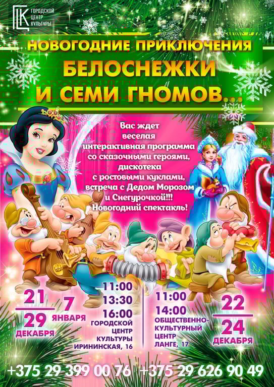 В Городском центре культуры в Рождество покажут интерактивную программу «Новогодние приключения Белоснежки и семи гномов». Дед Мороз и Снегурочка, а также дискотека с ростовыми куклами, тоже будут.