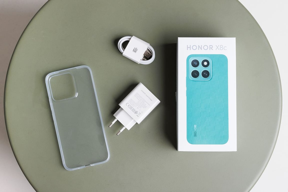 Для начала заглянем в коробку, в которой увидим. Как обычно у HONOR X8c полный комплект — кабель, зарядное устройство, скрепка для извлечения лотка SIM-карты, инструкция с гарантийником и прозрачный силиконовый чехол. Отметим, что блок питания не простой, а мощностью 35 Вт, чего достаточно для ускоренной зарядки HONOR X8c примерно за час.