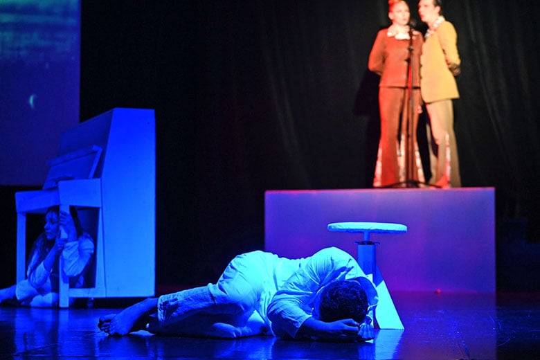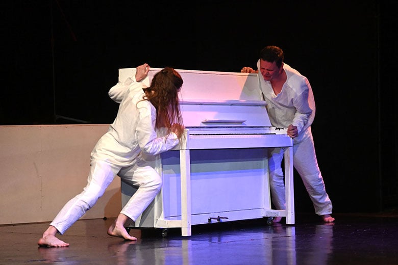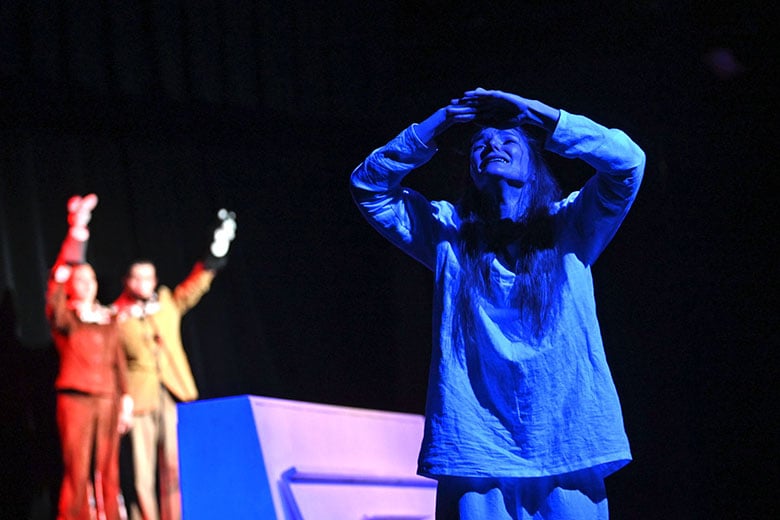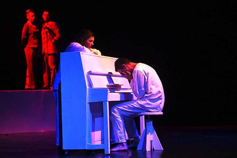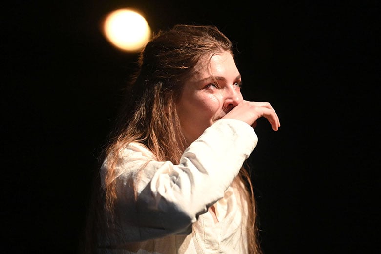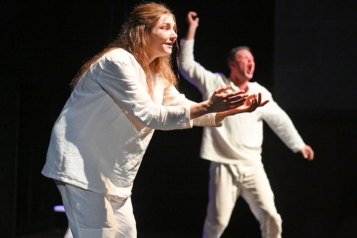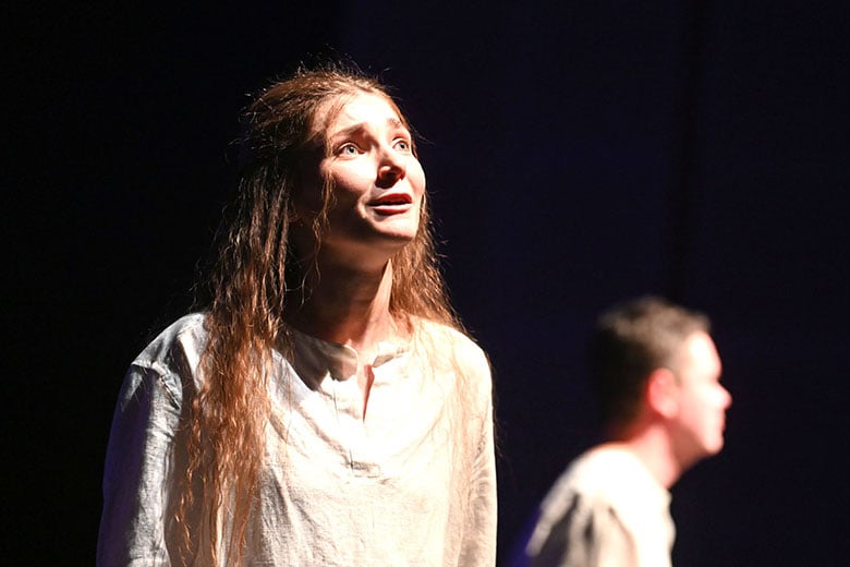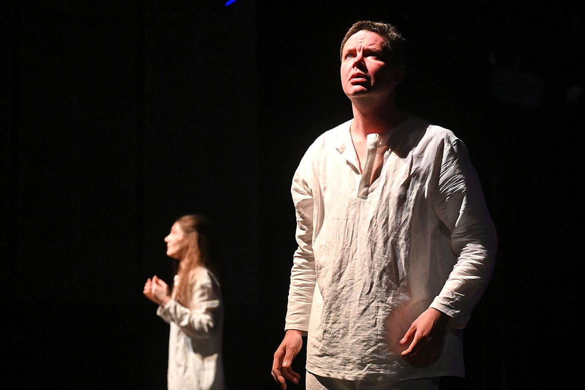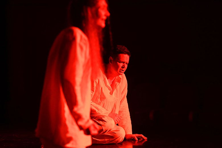 Образы главных героев – Нины и Вадима Николаевича, которых сыграли Валерия Цыкуненко и Павел Конёк, наоборот, словно специально упрощены. Они выходят на сцену босыми и в белой одежде. Так что зритель невольно всё внимание сосредотачивает на их эмоциях, на лицах. И они на протяжении всего спектакля говорят страшную правду, кричат, страдают.