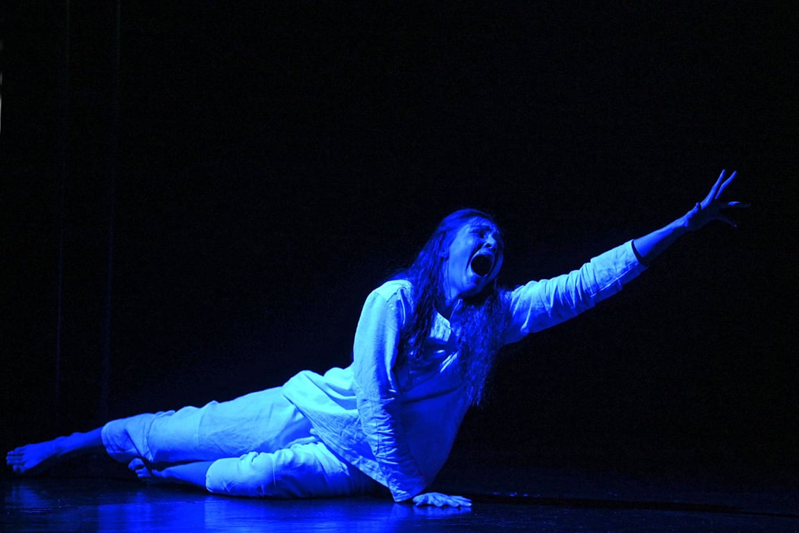 Тишину в небольшом зрительном зале вдруг разрывает вой приближающегося снаряда. Сидящие в креслах его не видят, но слышат так, будто где-то рядом идёт бой…