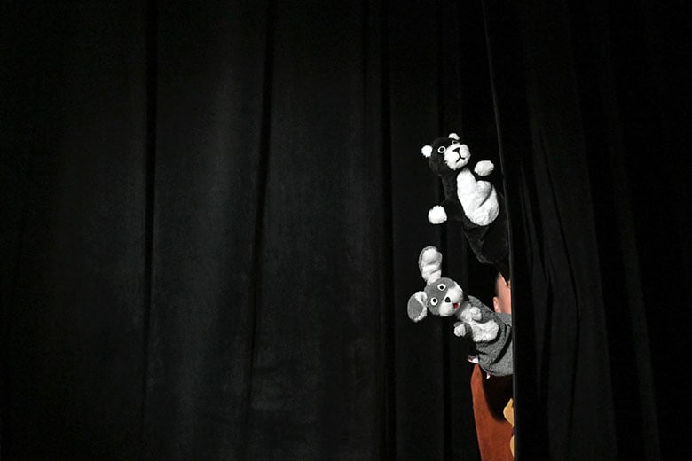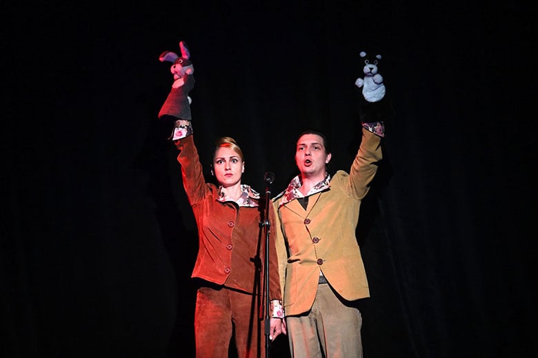 Режиссёр Роман Шидловский всё время играет на контрастах. Хоть самый большой контраст – двух времён, между которыми 30 лет, лежит уже в основе сюжета. Его только усиливают песни про любовь, перемежающиеся страшными кадрами военной хроники на экране, где грудами лежат трупы, Гитлер читает речь с трибуны, умирают истощённые дети… А актёры то и дело перевоплощаются в персонажей из кукольного театра – милого зайчика и мишку, и детскими голосами выкрикивают страшную статистику о количестве погибших во время Великой Отечественной войны. И в устах этих милых игрушек она звучит ещё страшнее.