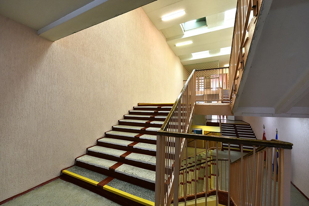 На 500 квадратных метрах лестничных пролетов, где высота стены достигает 6 м, кислотно-зелёный цвет заменили на спокойный бежевый. Стены отделали штукатуркой «короед». Материал, по словам директора, дает повышенную звукоизоляцию и долговечен. Теперь более десяти лет можно не заботиться о его восстановлении или замене. Следующий этап — оборудование лестничных маршей новыми перилами.