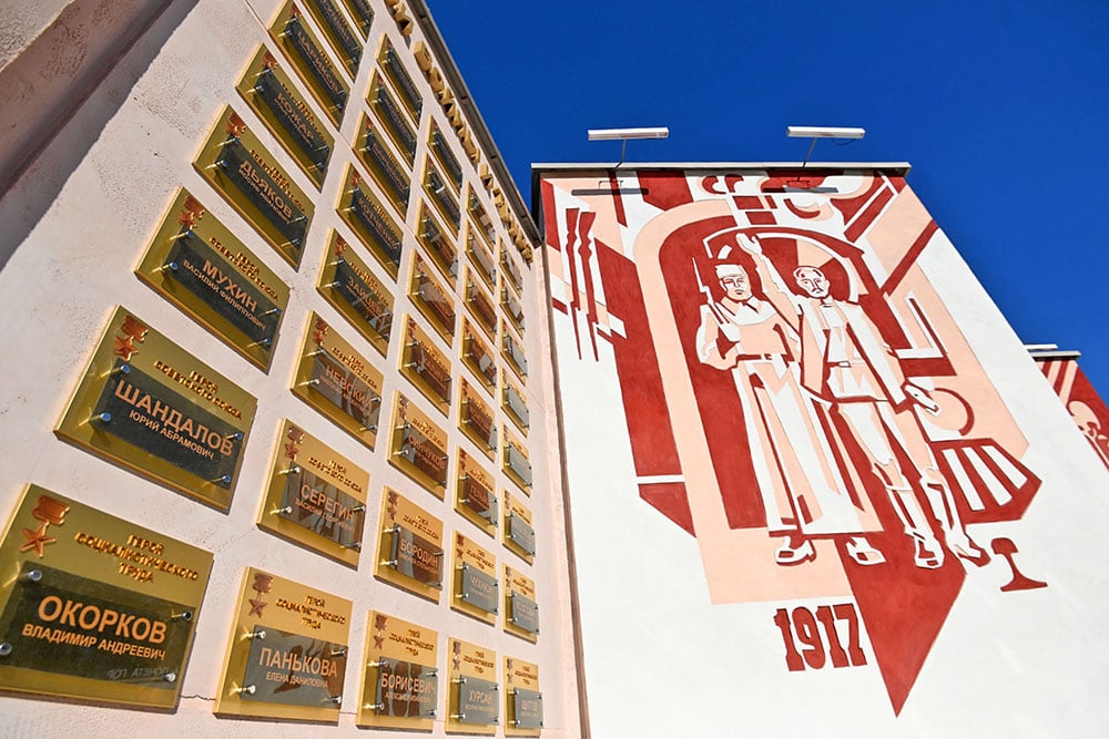 В 1999 году создал пять панно в сложной технике «сграффито» специально для Доски почёта гомельский художник-монументалист Владимир Евтухов. Но спустя четверть века картины выцвели и стали осыпаться.