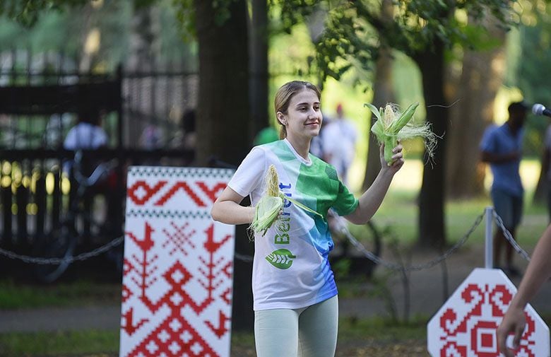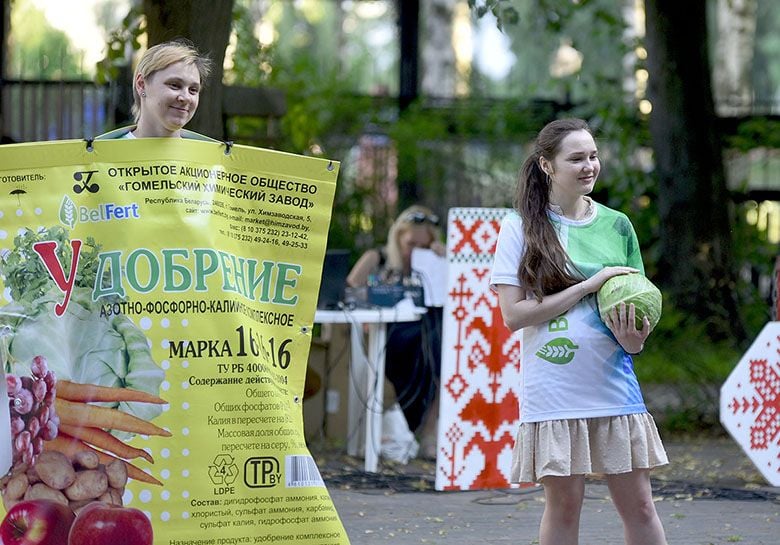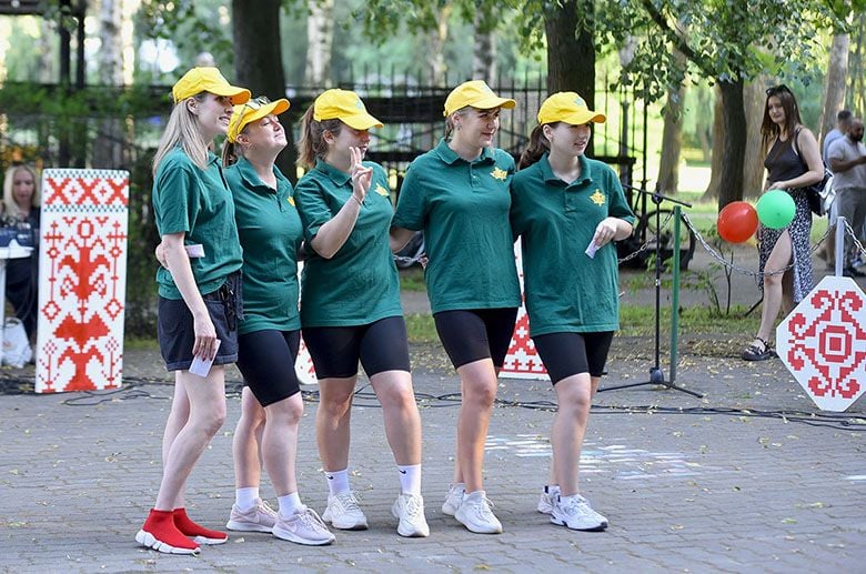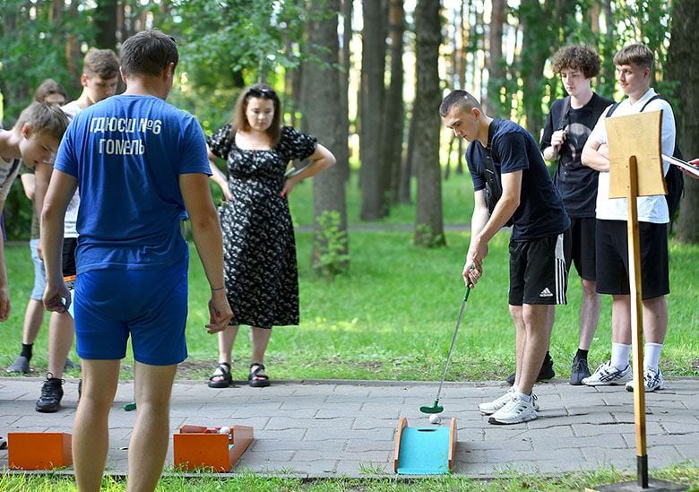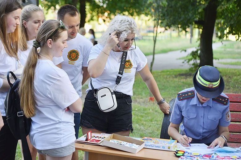 За высший балл — десятку — участников просили надеть обмундирование спасателей, забросить в лунки пять мячей подряд, ответить на вопросы о ПДД и белорусских брендах.