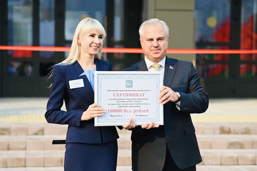 В подарок от руководства области и города учреждение дошкольного образования получило денежные сертификаты на 100 и 150 тысяч белорусских рублей. Эти деньги будут вложены в дальнейшее развитие материально-технической базы сада.