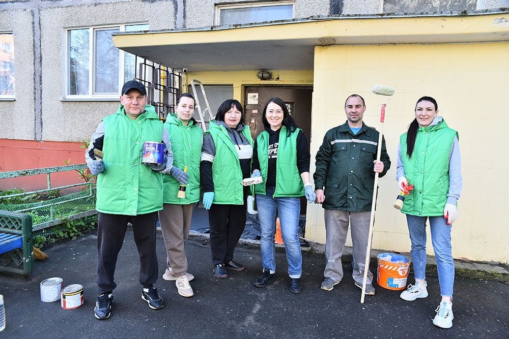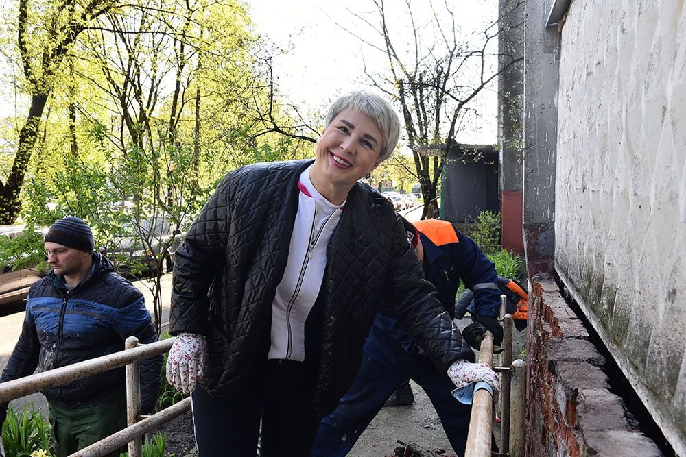 Возле девятиэтажки на Речицком проспекте, 33, с утра кипит работа. Здесь трудится десант предприятия «Милкавита». Из-за ярких форменных жилетов команду видно издалека. Руководит работой заместитель генерального директора Елена Лапова: