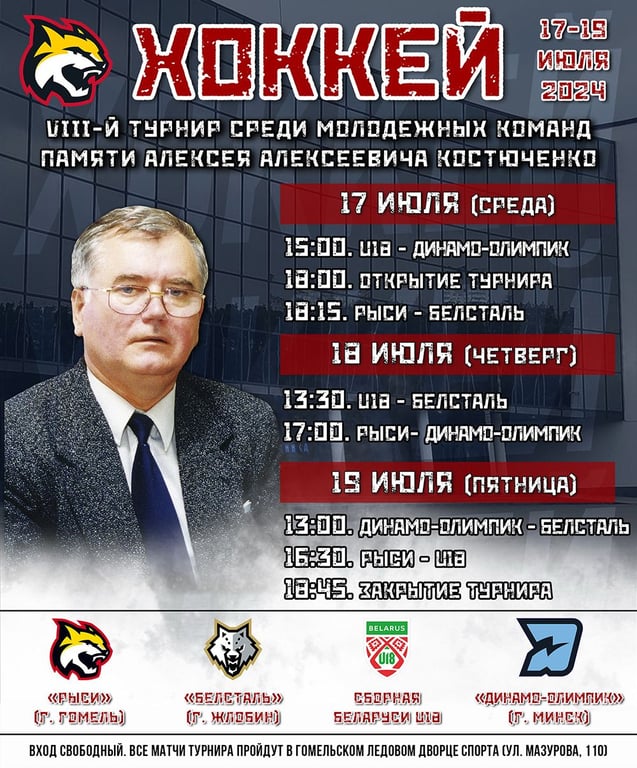 В турнире примут участие четыре молодежные команды, выступающие в Высшей лиге чемпионата Беларуси – «Рыси» (Гомель), «Белсталь» (Жлобин), «Динамо-Олимпик» (Минск), а также юниорская сборная Беларуси. Вход на трибуны свободный.