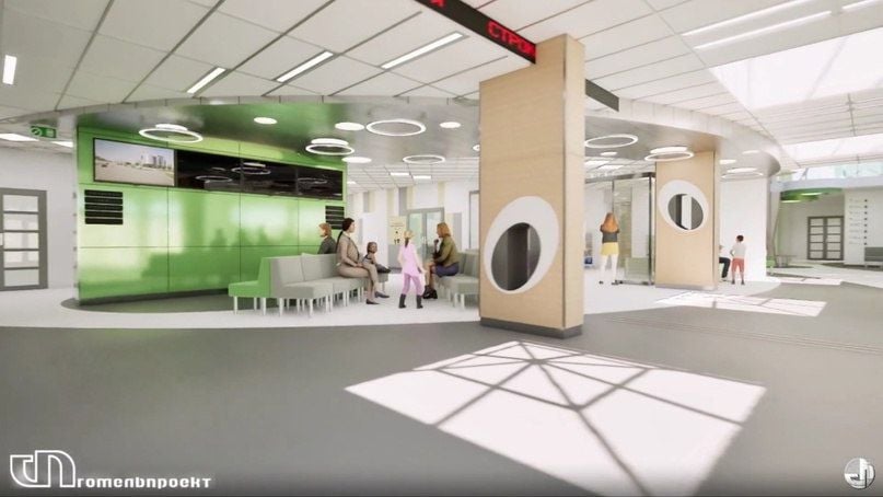 Всё здание и прилегающая к нему территория будут отвечать требованиям для обслуживания физически ослабленных лиц. Даже на подходах к высокому крыльцу обеспечат пологий подъём без ступеней по некрутой насыпи. Внутри будут работать пять лифтов.