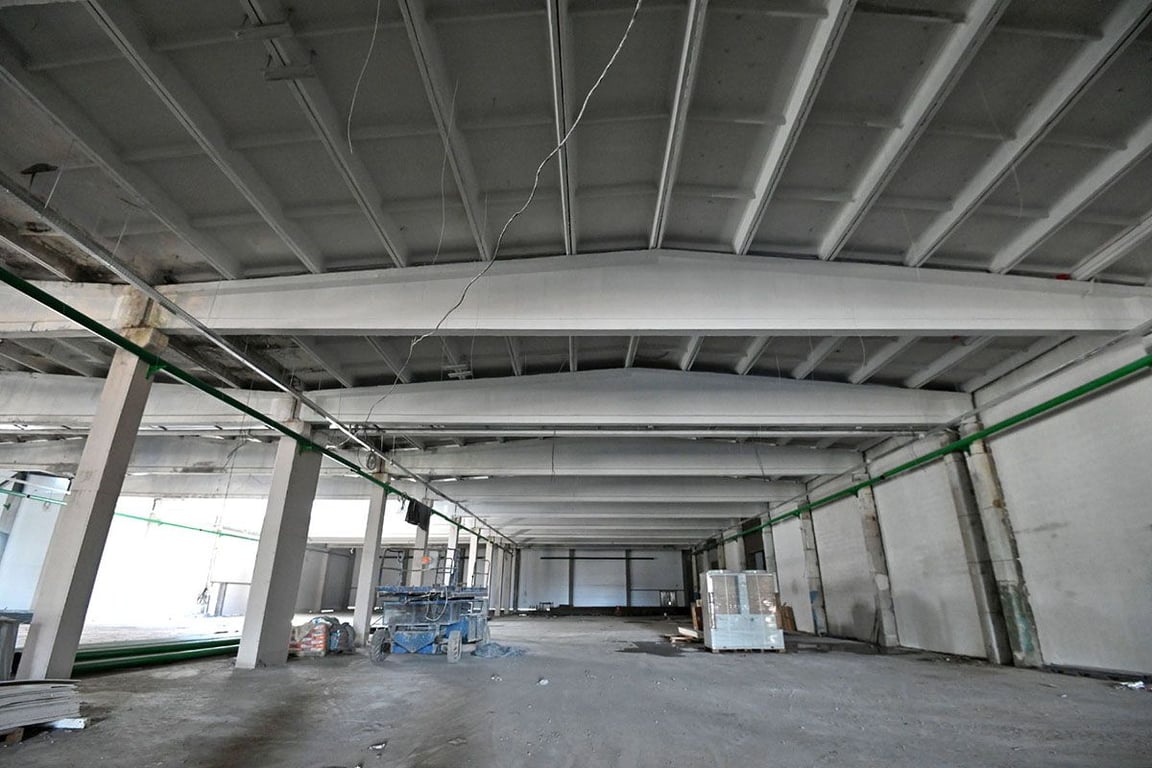 Одноэтажное здание уже накрыли плоской кровлей и облицевали сэндвич-панелями в трех цветах, которые чередуются между собой и создают некое подобие «шахматки». Внутри вовсю идут отделочные работы. От старого цеха сохранилась только часть колонн и ферм. Фундамент залили по-новому, трансформировалось и размещение оконных проемов и входных групп. Центральный вход в здание будет со стороны магазина «Маяк».