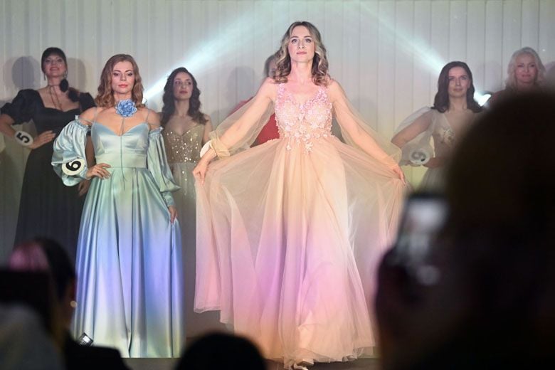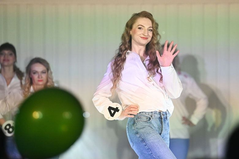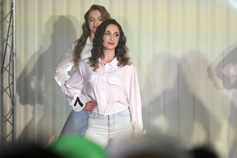 Для визитки девушки нарядилась в классические джинсы и белые рубашки. Яркий акцент только один — красная помада. Пока модели шагали по подиуму, ведущий зачитывал анкеты каждой: «любит шить», «танцует чечётку», «воспитывает близняшек», «окончила вуз с красным дипломом».
