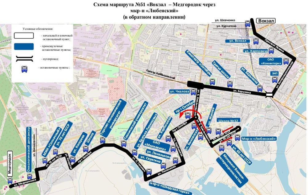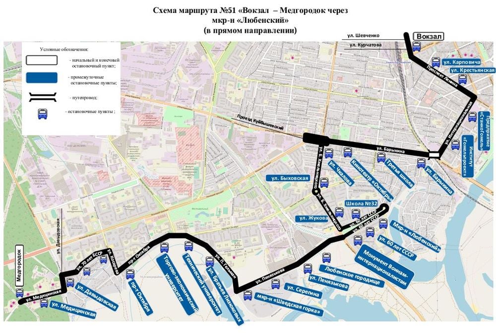 В направлении вокзала схема движения на остальных участках осталась прежней, через «Любенское городище». Но в сторону Медгородка автобус №51 будет ехать по улицам Хмельницкого, проспекту Октября (мимо «Арэсы») и улице Карбышева.