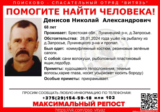 28 января пенсионер ушёл на рыбалку и не вернулся. ПСО “Витязь” просит сообщить любую имеющую информацию об этом человеке.
