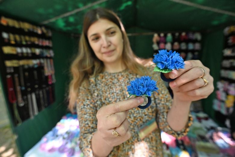 Татьяна Аникеева из Могилёва привезла на ярмарку в Гомель аксессуары для волос, сделанные собственными руками. Во многих использован символ Беларуси – василёк.