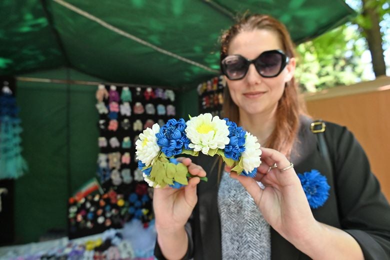 – Это яркий и красивый цветок. Он нравится и девочкам, и их мамам. Вот есть резинки с большим васильком. А веночки такие из васильков и ромашек мы плетём на Купалье в Александрию, они хорошо продаются. Сделаны из фоамирана вручную, каждый лепесток дополнительно окрашен масляной пастелью и обработан лаком. Это увеличивает срок изделия.