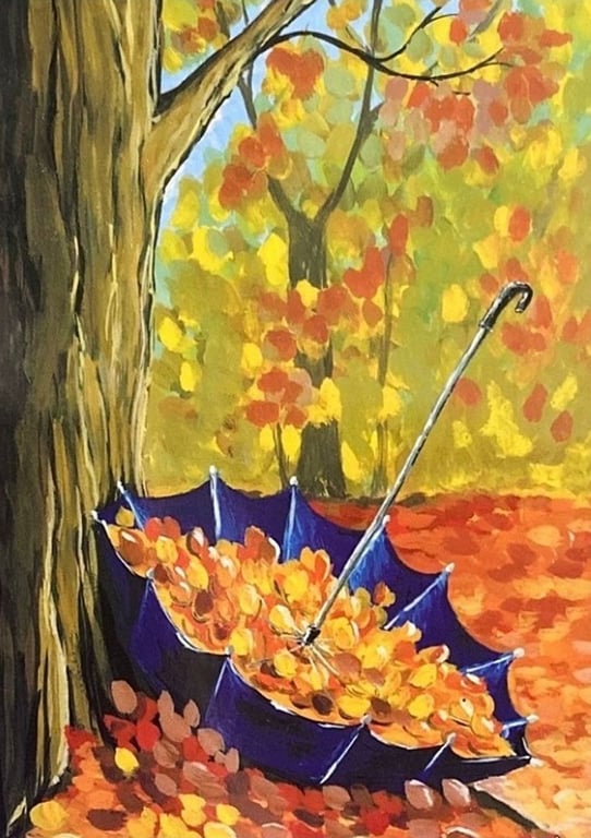 Так называется сюжет, который предлагатся воссоздать на мастер-классе в арт-студии «Мольберт». На картине — зонтик, полный опавшей листвы, золотые лучи солнца и деревья, только-только начавшие сбрасывать листья. Вот директ для записи: @molbert_by.