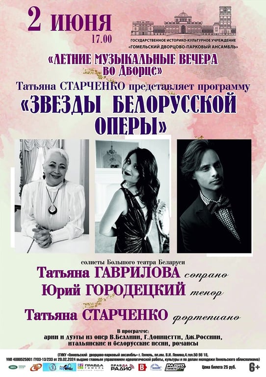 На музыкальный вечер во дворце Румянцевых и Паскевичей известная пианистка Татьяна Старченко пригласила настоящих звёзд оперной сцены, солистов Большого театра Беларуси: Татьяну Гаврилову (сопрано) и Юрия Городецкого (тенор). Артисты исполняют ведущие партии из репертуара театра. На концерте в Белой гостиной дворца прозвучат арии из опер, а также французские и итальянские песни под аккомпанемент Татьяны Старченко.