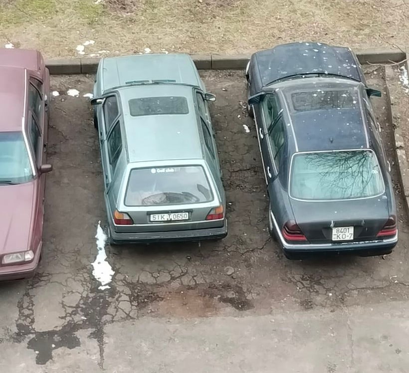 — Эта машина «держит» место своему хозяину во дворе. Справа от него на фото припаркован Mercedes — тот выезжает раз в месяц. Принадлежат машины одной семье. Глава последней передвигается на микроавтобусе. Когда он возвращается вечером домой, ставит машину перпендикулярно этим двум.