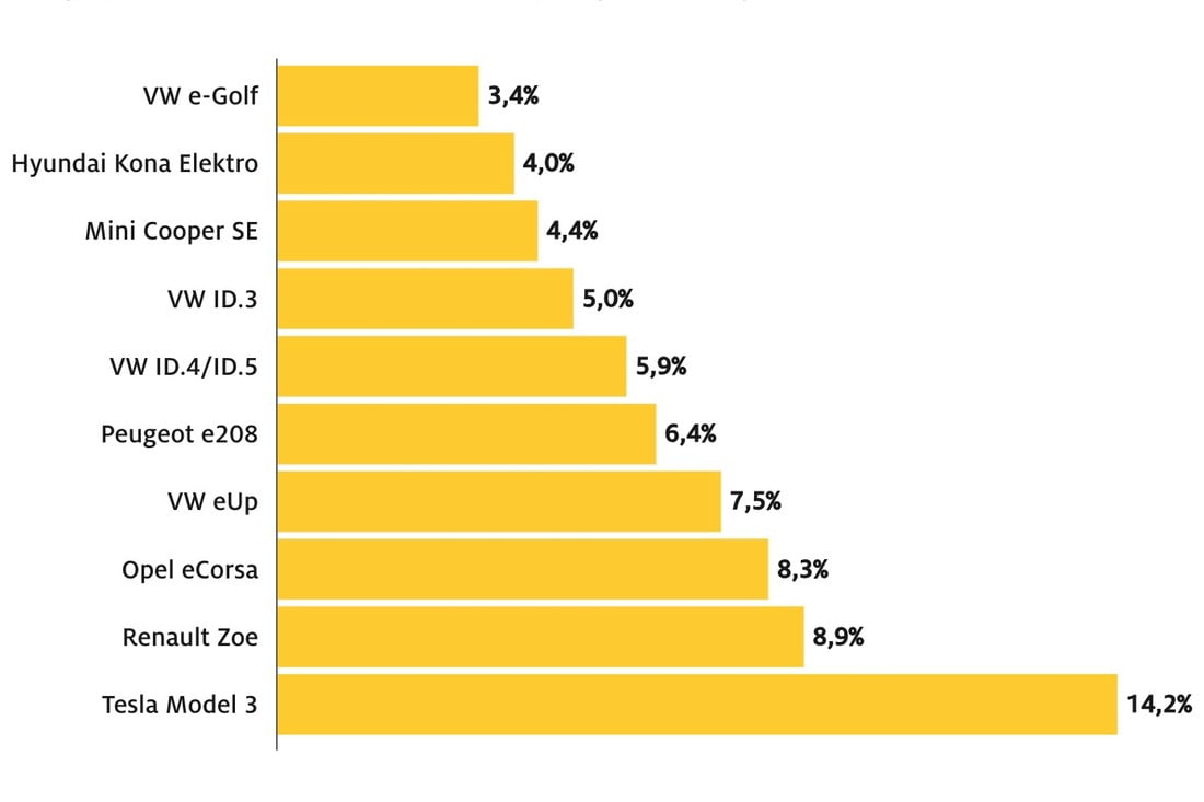 В частности, VW e-Golf, который уже снят с производства, является лучшим электромобилем в категории автомобилей в возрасте 2—3 лет, заняв 9 место из 111 с результатом 3,4% (имеется в виду процент брака).