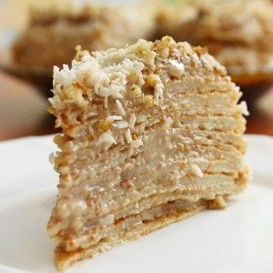 Из названия очевидно, что главным компонентом торта будут блины, испечённые по любому рецепту «Домашней кухни. Печем вкусные блины на масленичной неделе».