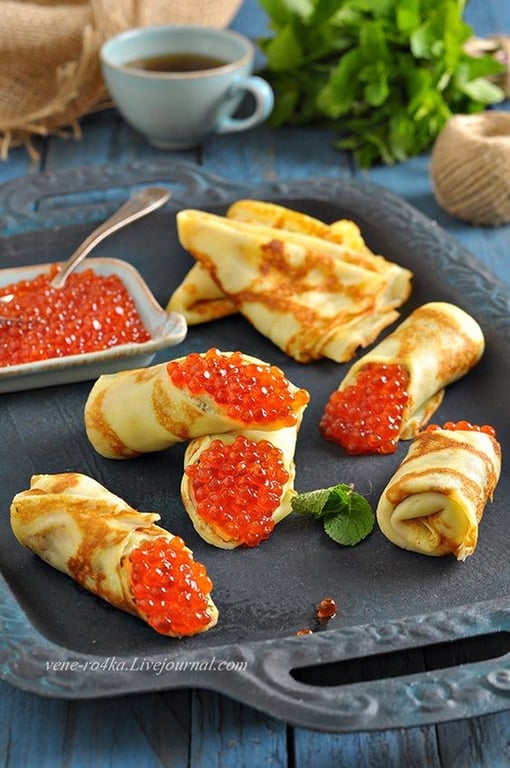 Для начинки царских блинов очень подойдет красная лососёвая или черная осетровая икра. В крайнем случае можно использовать икру других сортов рыбы от мойвы до трески.
