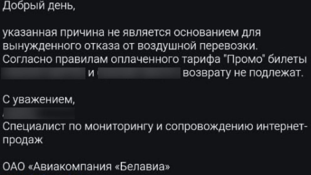 На наш официальный запрос пришел отказ от „Белавиа“. Ниже на скрине будет формулировка, исходя из которой получается, что сборы, которые объявило Минобороны, не являются основанием для вынужденного отказа от перелета. Поэтому мне интересно, кто прав в этой ситуации?»