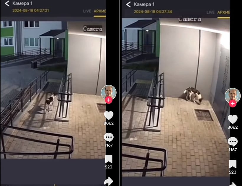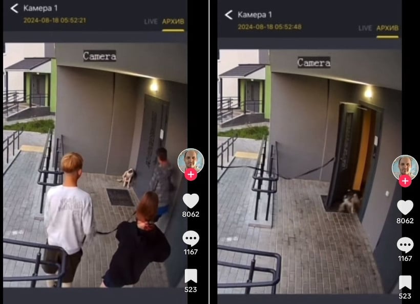 Скриншот с камеры наблюдения, на котором видно, как собаку впускают в подъезд