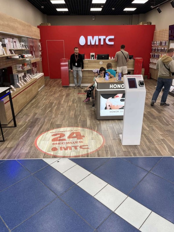 Гобо проекция — это технология, которая использует свет и специальные линзы (гобо) для проецирования изображений или текста на поверхность. С помощью гобо проекторов можно создавать яркие и четкие изображения, которые привлекают внимание проходящих мимо людей. В салонах МТС такие проекторы установлены перед входом, где они транслируют рекламные сообщения о текущих акциях и предложениях.