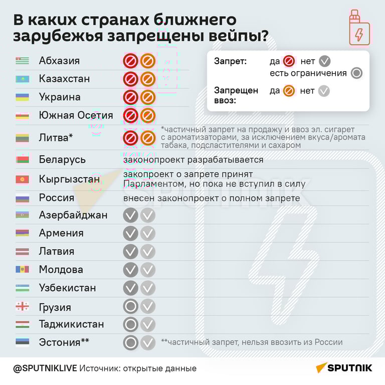 В Беларуси вопрос о запрете вейпов в Беларуси прорабатывается, а в некоторых странах бывшего СССР их уже полностью запретили. Какая ситуация с вейпами в этих странах сейчас – смотрите в инфографике Sputnik Беларусь.
